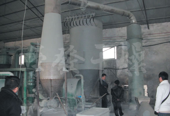 熱空氣切線進入干燥器底部,在攪拌器帶動下形成強有力的旋轉風場。膏狀物料由螺旋加料器進入干燥器內,在高速旋轉攪拌槳的強烈作用下,物料受撞擊、磨擦及剪切力的作用下得到分散,塊狀物料迅速粉碎,與熱空氣充分接觸、受熱、干燥。脫水后的干物料隨熱氣流上升,分級環將大顆粒截留,小顆粒從環中心排出干燥器外,由旋風分離器和除塵器回收,未干透或大塊物料受離心力作用甩向器壁,重新落到底部被粉碎干燥。