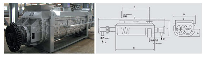 空心軸上密集排列著楔型中空漿葉,熱介質經空心軸流經漿葉。單位有效容積內傳熱面積很大,熱介質溫度從-40℃到320℃,可以是水蒸汽,也可以是液體型:如熱水、導熱油等。間接傳導加熱,沒有攜帶空氣帶走熱量,熱量均用來加熱物料。熱量損失僅為通過器體保溫層向環境的散熱。楔型漿葉傳熱面具有自清潔功能。物料顆粒與楔型面的相對運動產生洗刷作用,能夠洗刷掉楔型面上附著物料,使運轉中一直保持著清潔的傳熱面。漿葉干燥機的殼體為Ω型,殼體內一般安排二到四根空心攪拌軸。殼體有密封端蓋與上蓋,防止物料粉塵外泄而充分發揮作用。