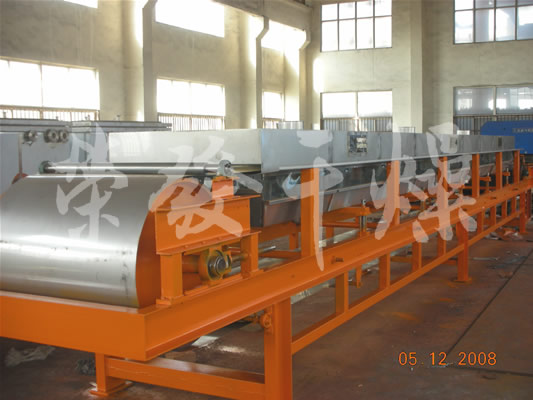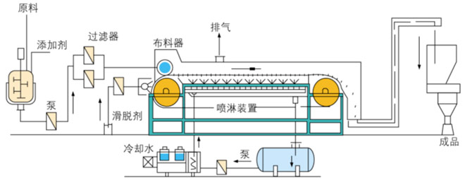 該機(jī)由液體變固體粒狀,主要是通過(guò)造粒模頭造粒,采用回轉(zhuǎn)式鋼帶連續(xù)進(jìn)行,通過(guò)噴淋水冷卻定型。
