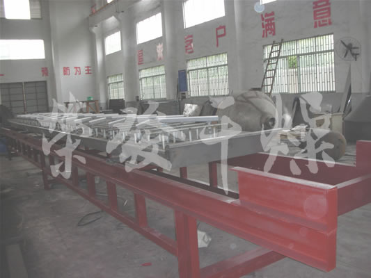 該機(jī)主要由落料模造粒成型機(jī)頭,冷卻輸送不銹鋼帶及帶輪、噴淋冷卻系統(tǒng)、傳動(dòng)系統(tǒng)、保溫裝置、機(jī)架、刮刀等組成。落料模造粒機(jī)頭主要由機(jī)頭模套和機(jī)頭芯軸等組成。噴淋冷卻系統(tǒng)主要由噴頭、盛水池等組成。傳動(dòng)系統(tǒng)主要由減速箱(減速器)調(diào)速電機(jī)等組成。