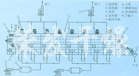 豆粕專用帶式干燥機由進料系統、布料系統、進風過濾系統、加熱冷卻系統、主機、傳動系統、旁路過濾系統、出料系統、排風排濕系統、控制系統等組成。工作時,由進料系統給料至布料系統,將物料加入帶式干燥機,物料與穿過網帶的穿流式熱風、冷風相遇,進行傳熱、傳質,熱風循環利用使能耗更低,達一定濕度后,部分強制排濕帶走水分,物料完成干燥并冷卻。